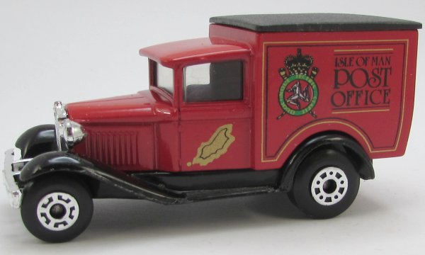 red, black chassis, black textured roof, KG license plate, ISLE OF MAN POST OFFICE, gold island, no phone # on rear doors deco |