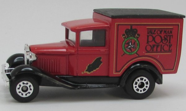 red, black chassis, black textured roof, KG license plate, ISLE OF MAN POST OFFICE, black island, phone # on rear doors deco |