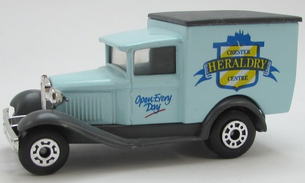 powder blue, dark gray chassis, dark gray textured roof, KG license plate, dark blue CHESTER HERALDRY CENTRE deco |