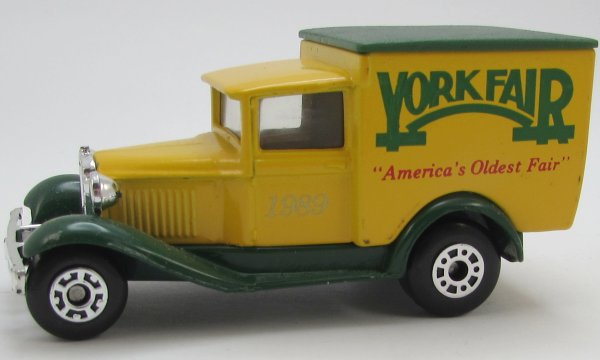 yellow, green chassis, green textured roof, KG license plate, YORK FAIR 1989 deco |