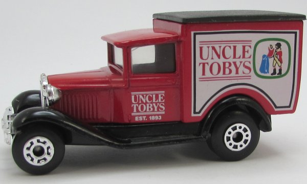 red, black chassis, black textured roof, KG license plate, UNCLE TOBYS deco |