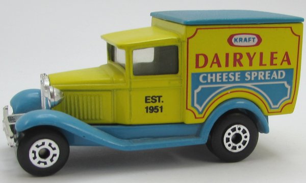 lemon, light blue chassis, light blue textured roof, KG license plate, DAIRYLEA CHEESE SPREAD deco |