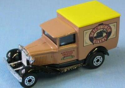cocoa brown, black chassis, yellow textured roof, PC license plate, BEECHWORTH BAKERY deco |