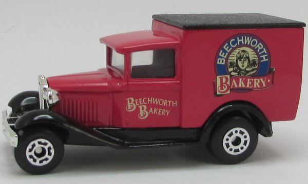 red, black chassis, black textured roof, KG license plate, BEECHWORTH BAKERY, MB038AED on chassis deco |