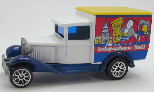 white, blue chassis, yellow roof, INDEPENDENCE HALL deco |