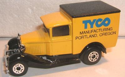 yellow, black chassis, black textured roof, KG license plate, TYCO MANUFACTURING PORTLAND, OREGON deco |