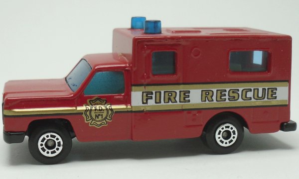 red, dark red rear doors, gold and white stripe, FIRE RESCUE deco |
