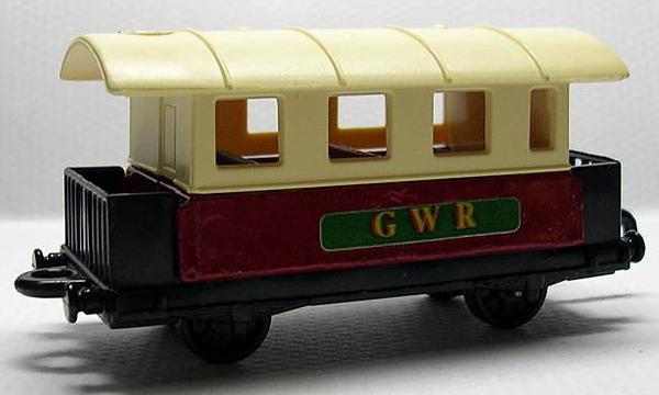 red, cream flat roof, small side windows or raised part of roof at rear roof fitting, flush end rivets, GWR (from SF47c) deco |
