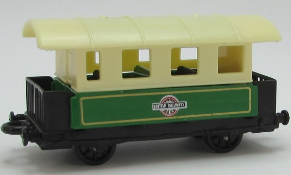 green, cream roof, small side windows or raised part of roof at front roof fitting, with end ridges, flush end rivets, BRITISH RAILWAYS deco |
