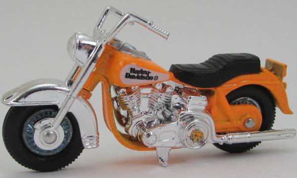 orange, chrome front fender, chrome handlebars, black seat, no rider, no slot in riders hand, HD orange on white tampo |