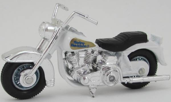 white, chrome front fender, chrome handlebars, black seat, no rider, no slot in riders hand, HD blue on gold tampo |