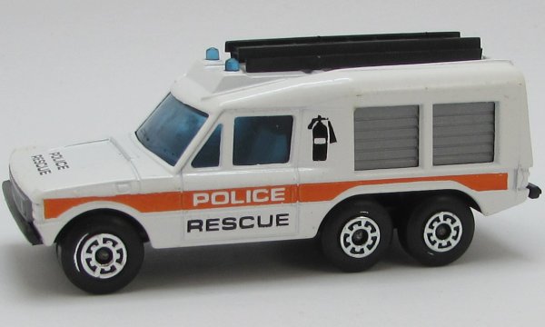 white, dark blue roof lights, black ladders roof attachment, POLICE RESCUE, orange stripe tampo |