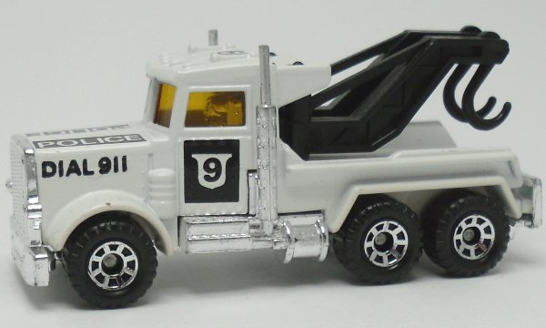 white, with body ridge, filled back of cab, black booms, chrome exhausts, with fender braces, chrome grille, POLICE 9 (black) tampo |
