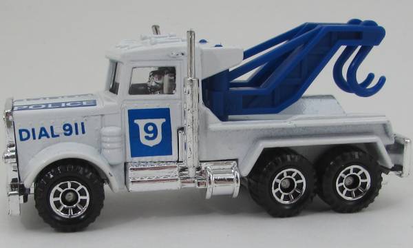 white, with body ridge, filled back of cab, blue booms, chrome exhausts, with fender braces, chrome grille, POLICE 9 (blue) tampo |