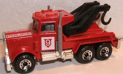 red, no body ridge, filled back of cab, black booms, gray exhausts, front only fender braces, chrome grille, POLICE 9 (white) tampo |
