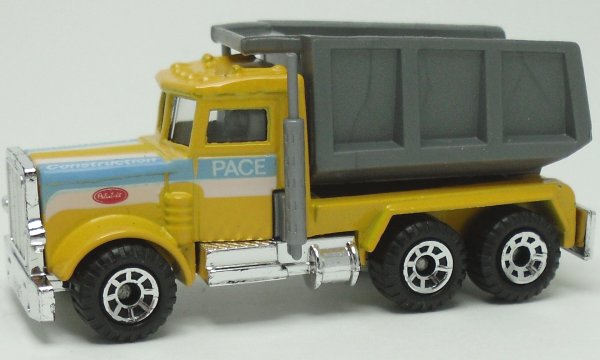 dark yellow, dark gray textured dump, gray exhausts, PACE, light blue and white stripe tampo |