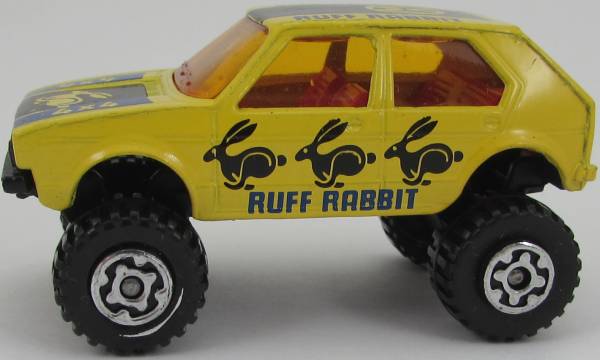 yellow, with tow hook, 4x4, rabbit facing left hood, RUFF RABBIT side tampo |