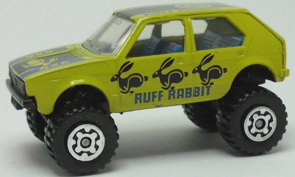 yellow, with tow hook, 4x4, rabbit facing right hood, RUFF RABBIT side tampo |