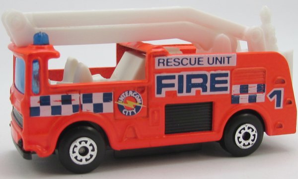 fluorescent orange, blue roof lights, white boom, checkers, RESCUE UNIT FIRE 1, IC tampo |
