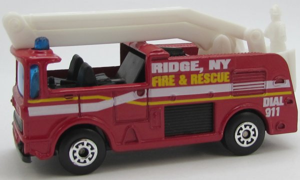 red, blue roof lights, white boom, RIDGE, NY FIRE and RESCUE tampo |