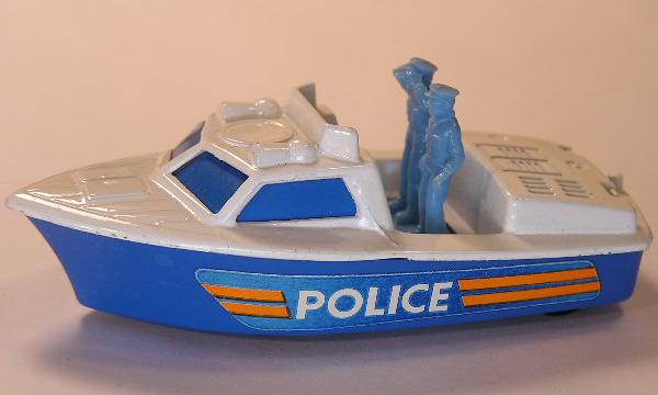 white deck, light blue hull, hatch on roof, light blue figures, blue POLICE deco |