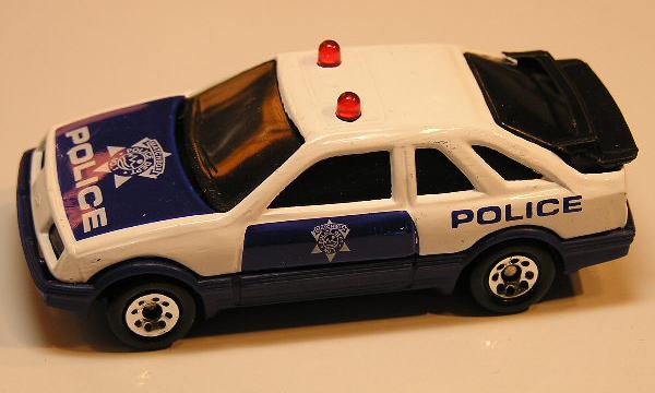 white, black lower body, black hatch, red roof lights, with sunroof cast, blue POLICE tampo |
