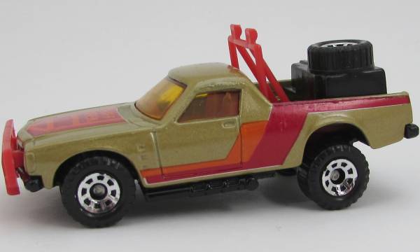 light metallic tan, red bumper and roll bar, black rear load, red and orange RUFF TREK tampo |
