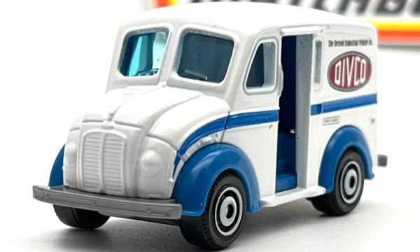 white, blue fenders, blue rear doors, maroon background DIVCO logo tampo |