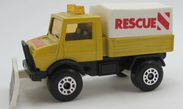 yellow, black plastic chassis, white plow, black plow stripes, white canopy, RESCUE canopy tampo, with MB 125 inside canopy, RESCUE cab tampo |