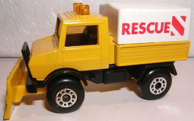 yellow, black plastic chassis, yellow-orange plow, black plow stripes, white canopy, RESCUE canopy tampo, with MB 125 inside canopy, no cab tampo |