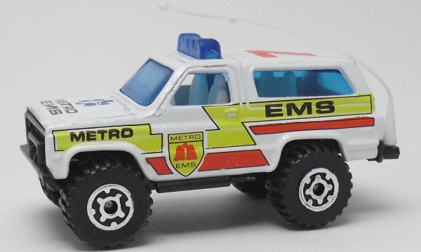 white, blue roof light, black grille, white antenna, METRO EMS 7, yellow and orange stripes tampo |