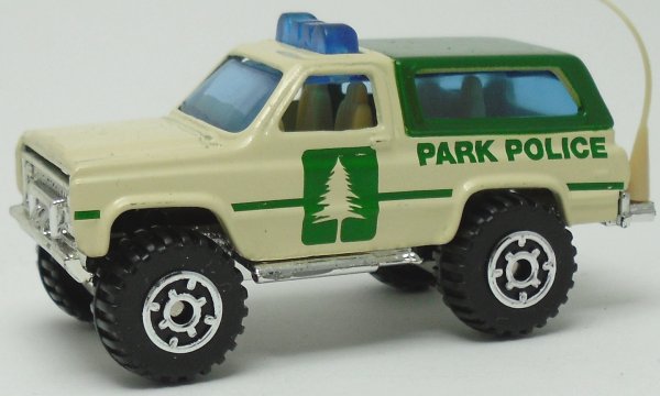 beige, blue roof light, chrome grille, tan antenna, PARK POLICE tampo |