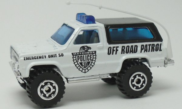 white and black, blue roof light, chrome grille, white antenna, OFF ROAD PATROL tampo |