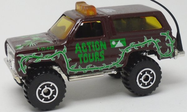 brown, amber roof light, chrome grille, black antenna, ACTION TOURS, MB2000 on roof tampo |