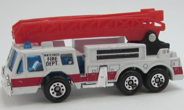white, black turret, transluscent red ladder, MATCHBOX FIRE DEPT. and red stripe tampo |