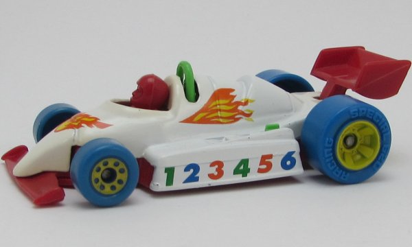 white, lime rollbar and exhausts, red driver, 123456 and flames tampo, red plain airfoil tampo |