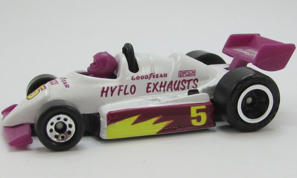 white, black rollbar and exhausts, plum driver, HYFLO EXHAUSTS 5 tampo, plum HYFLO airfoil tampo |