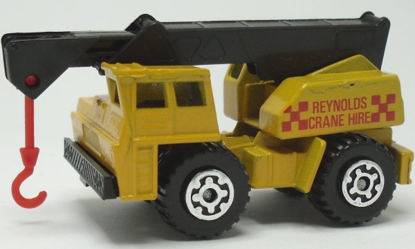 yellow, yellow metal crane cab, black boom, red hook, straight FAUN at front, REYNOLDS CRANE HIRE tampo |