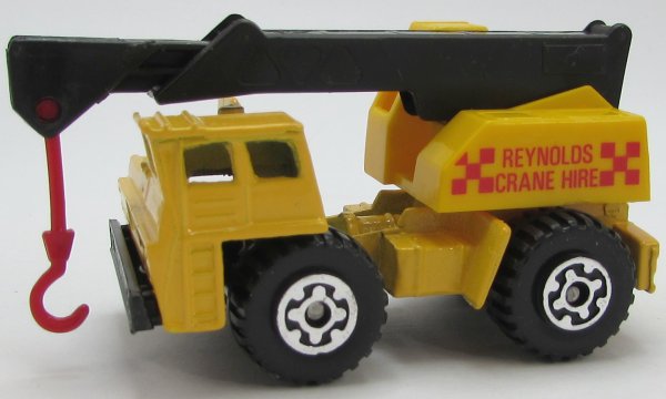 yellow, yellow plastic crane cab, black boom, red hook, straight FAUN at front, REYNOLDS CRANE HIRE tampo |