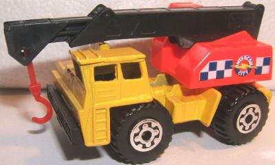 yellow, fluorescent orange plastic crane cab, black boom, red hook, straight FAUN at front, checkers and IC logo tampo |