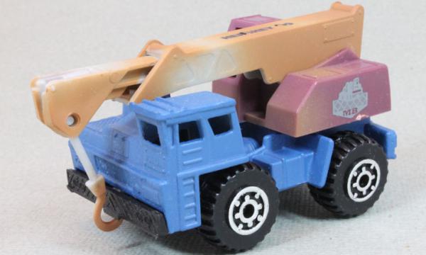 matte blue, plum plastic crane cab, gray and brown boom, gray hook, slanted FAUN at front, MB logo and brown dirt, HERSHEY '99 tampo |