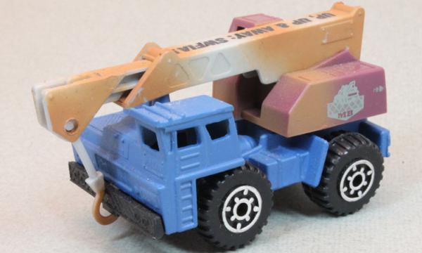 matte blue, plum plastic crane cab, gray and brown boom, gray hook, slanted FAUN at front, MB logo and brown dirt, SWFIA tampo |