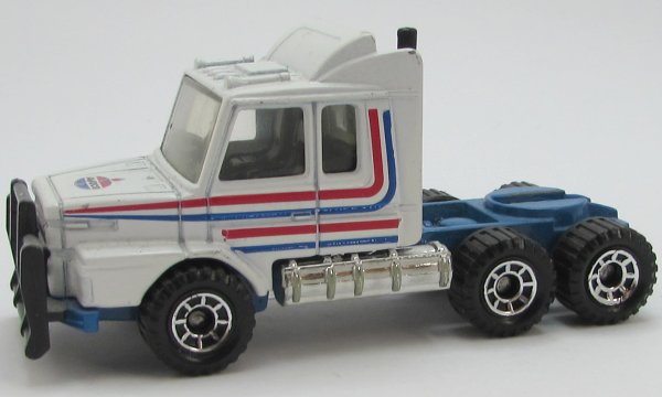 | white, blue chassis, black grille, red and blue stripes, AMOCO |