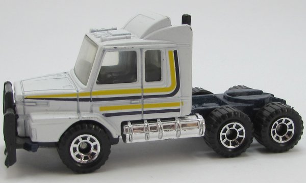 | white, blue chassis, black grille, yellow and dark blue stripes |