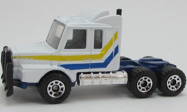 | white, dark blue chassis, black grille, yellow and blue stripes |