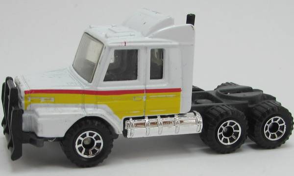 white, dark gray chassis, black grille, thin red, wide yellow stripes tampo |