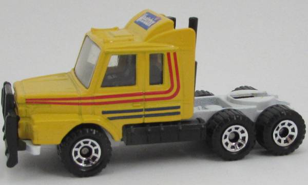 | yellow, white chassis, black grille, red and black stripes, WEETABIX |