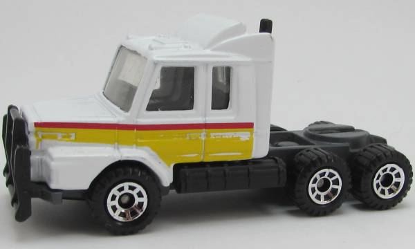 white, dark gray chassis, black grille, thin red, wide yellow stripes tampo |