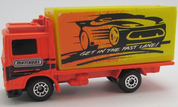 fluorescent orange, yellow container, MATCHBOX on cab / FAST LANE on container (sided) deco |