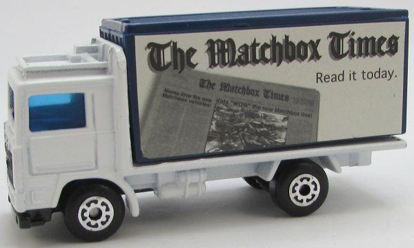 | white, dark blue container, THE MATCHBOX TIMES (sided) |